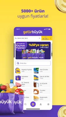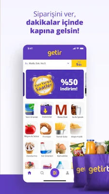 Ev ihtiyaçlarınızı karşılamak artık çok daha pratik. GetirBüyük ile haftalık veya aylık market alışverişlerinizi online olarak zahmetsizce tamamlayın, binlerce ürün arasından seçim yapın ve poşetlerinizi kapınızda teslim alın. Karnınız mı acıktı? GetirYemek, Burger King, McDonald's, Domino's Pizza gibi sevilen zincirlerden ve yerel restoranlardan taze ve sıcak yemekleri hızla adresinize ulaştırır. Mahallenizdeki kasap, manav veya fırın gibi esnaf dükkanlarından alışveriş yapma özgürlüğünü GetirÇarşı ile keşfedebilir, GetirSu ile damacana siparişlerinizi anında verebilirsiniz.